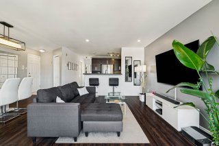 Cette unité lumineuse et spacieuse de 2 chambres à coucher offre une configuration fonctionnelle, idéale pour une vie confortable et pour recevoir en toute convivialité. L'aire ouverte du salon et de la salle à manger s'harmonise parfaitement avec la cuisine, créant un espace accueillant baigné de lumière naturelle. Les grandes fenêtres accentuent la sensation d'espace et procurent une ambiance chaleureuse.